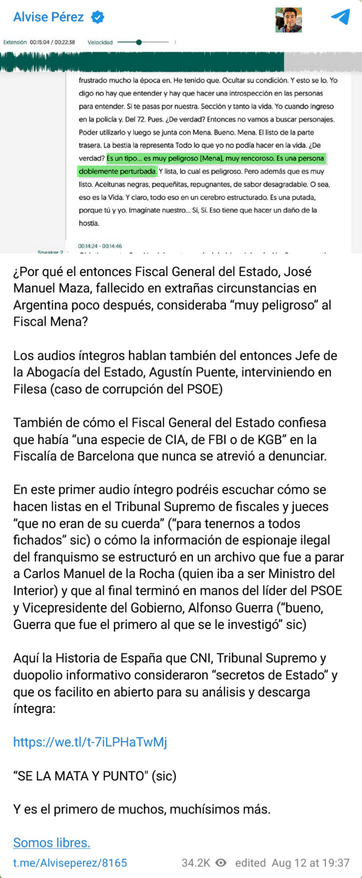 En este mensaje que acaba de poner Alvise, la Organización a la que se refiere, con cabeza en la Fiscalía de Barcelona (la cabeza era Mena, ahora eZ otro), es la que está sacada a la luz en el Expediente Royuela, al que nunca ha hecho mención ni caso.