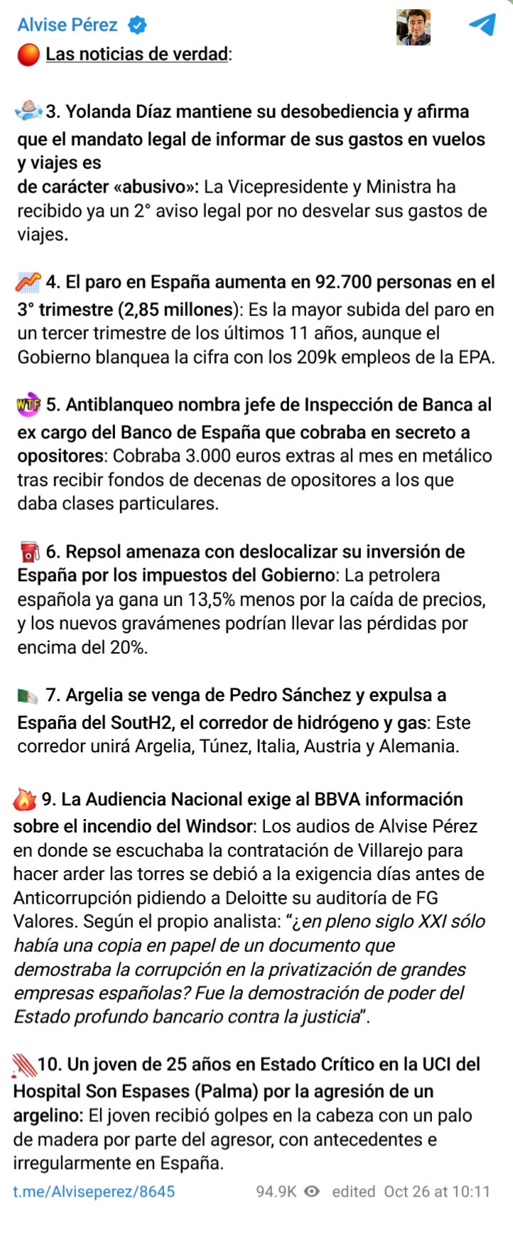 3. El Ministerio de Presidencia trabaja ya en la reforma de una ley franquista sobre información clasificada -firmada por Carrero Banco en 1968- para saltarse a conveniencia la Ley de Transparencia: El Ejecutivo planea un régimen sancionador que castigue con multas exorbitadas la filtración de información que el Gobierno considere 'clasificada'. Esta medida surge tras las publicaciones del analista Alvise Pérez, que ha logrado vencer hasta ahora la presión judicial gubernamental que sufre en España.