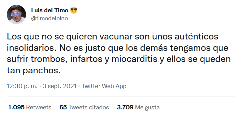 Dos videos de los muchos que estoy recopilando, me han desencadenado esta panorámica abreviada, porque resumen en pocos minutos (poco más de seis entre los dos) argumentos suficientes para responder sobre estas vacunas COVID. Los he unido y enlazo a continuación. El primero es una panorámica resumida, desde el punto de vista técnico (bioquímico y sanitario), que dura 2 minutos, y el otro; análogo pero desde el punto de vista epidemiológico, a través de un reportaje de TV, dura 4 minutos.