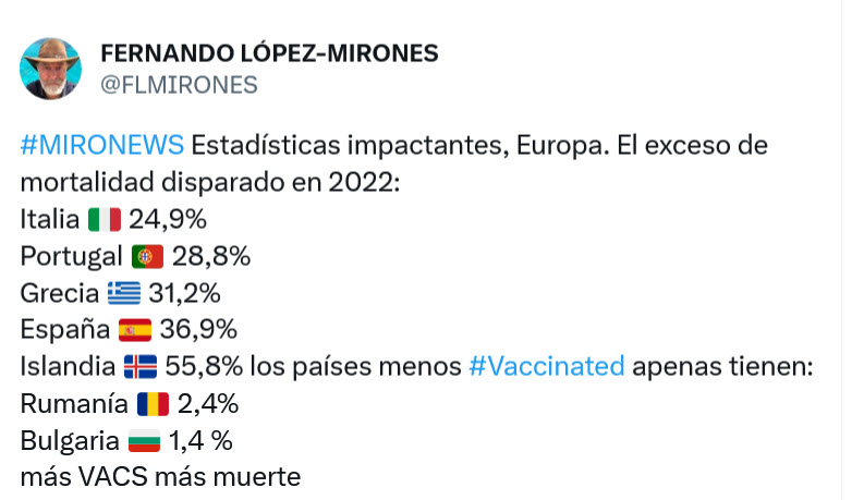 Del mismo modo, aquí en España, se aplicaron protocolos recomendados por la OMS que mandaban a la gente a casa con paracetamol hasta que estuvieran graves y luego eran tratados con antivirales cuando ya habían desarrollado la insuficiencia respiratoria, a causa de las neumonías bilaterales y las temidas tormentas de citoquinas. Ahora sabemos que esto solo agrava la situación que generalmente acaba con el enfermo intubado, matando a 8 de cada 10. Vamos, que los protocolos han sido los causantes de la muerte de la mayoría de los hospitalizados, no ningún virus.
